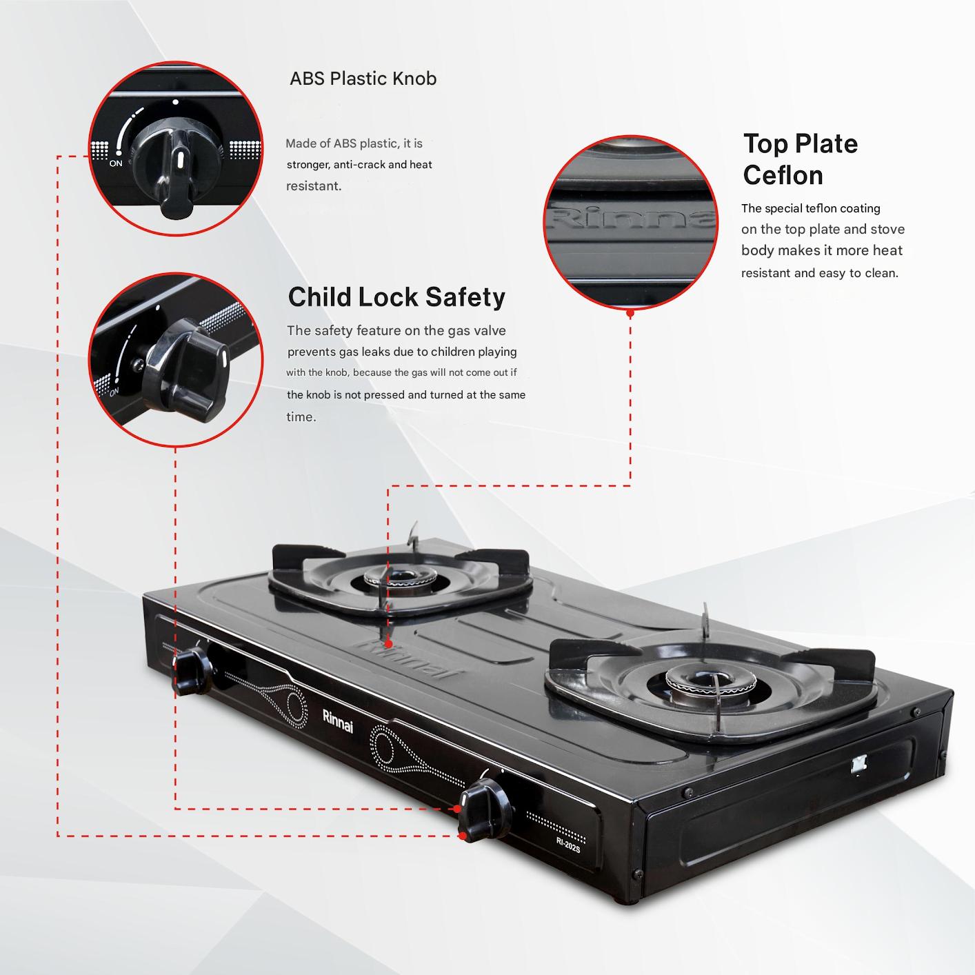 Model: Rinnai RI-202S Type: Table Top Gas Stove Number of Burners: 2 Burner Type: Brass burner