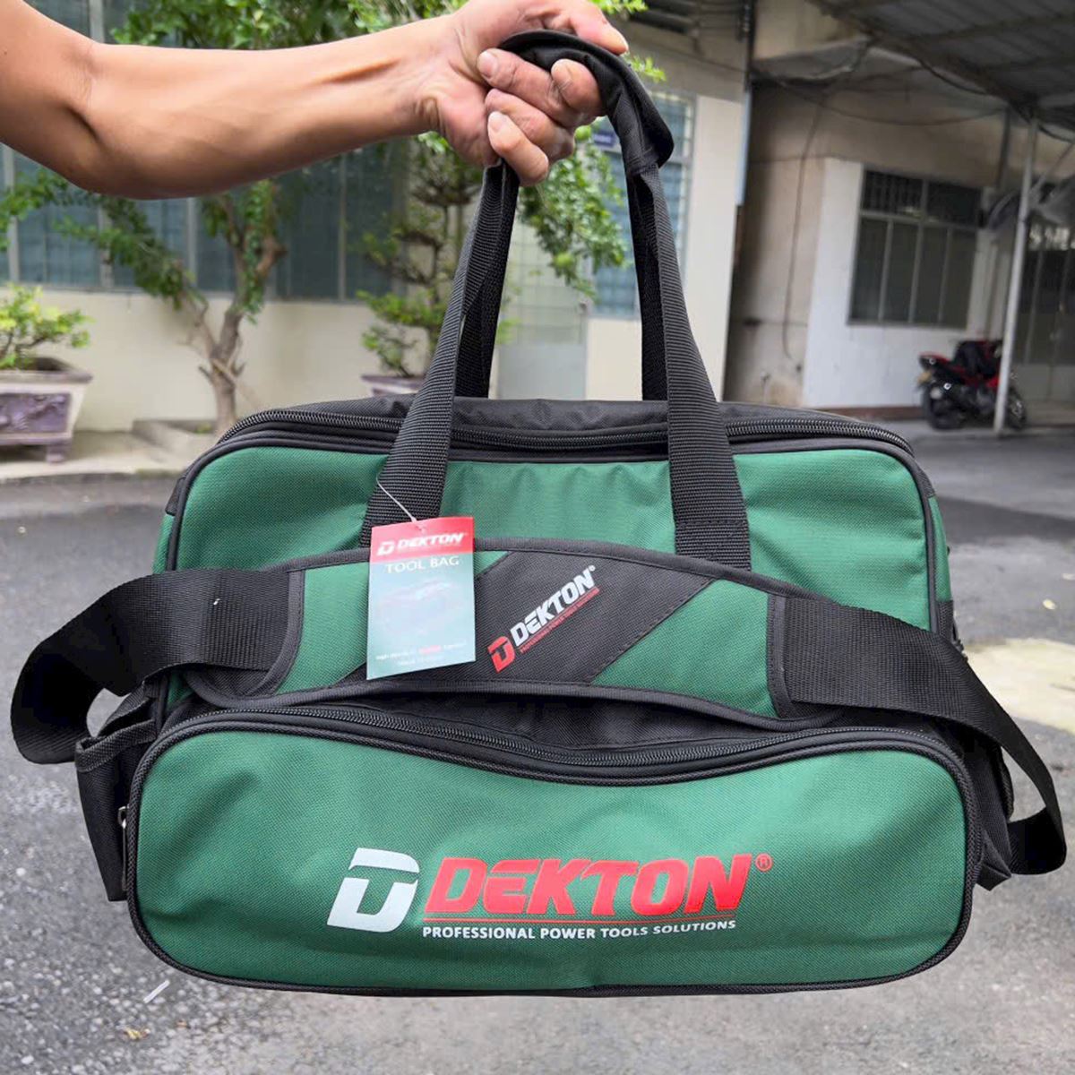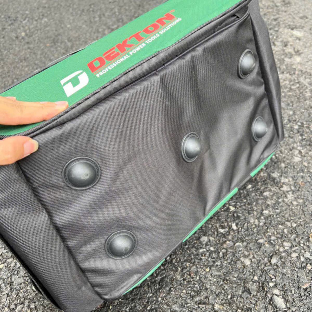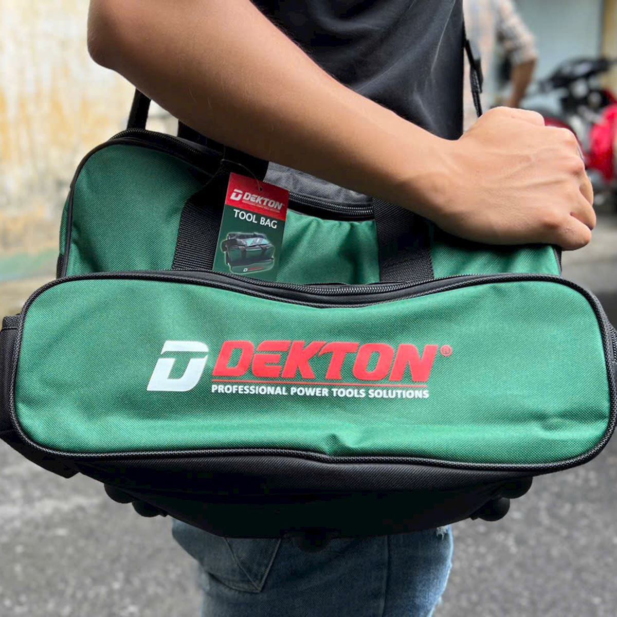 The Dekton DK‑TBG01 is a durable and well-organized tool bag designed for cordless tool and accessory storage. Constructed from 600D Oxford polyester, it is lightweight yet robust and ideal for carrying power tools, batteries, chargers, and small parts.