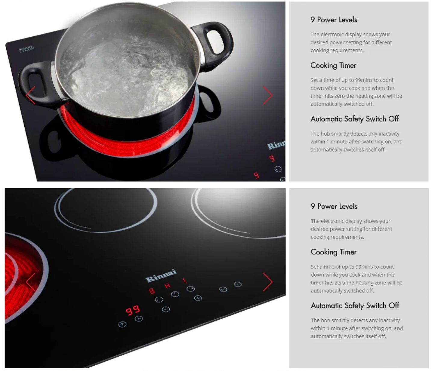 Control Type: Touch control panel or rotary knobs. Power Settings: Multiple heat levels.